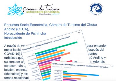 In May 2020, to support the post-COVID19 reconstruction of the tourism sector in the northwest of the Chocó-Andino Biosphere reserve, Rios Andinos designed and implemented the first socioeconomic survey of the members of the Chamber of Tourism of the Chocó Andino (CTCA) and other tourism establishments and agricultural producers in the area. This survey provides critical information to understand the financial and socioeconomic impact of COVID19 in the tourism sector in areas such as net revenue, jobs, income and employment, and the financial needs for the recovery effort. The membership of the CTCA is now using the resulting data to formulate recovery project proposals to reactivate the area's tourism sector. The survey was implemented in collaboration with the CTCA.